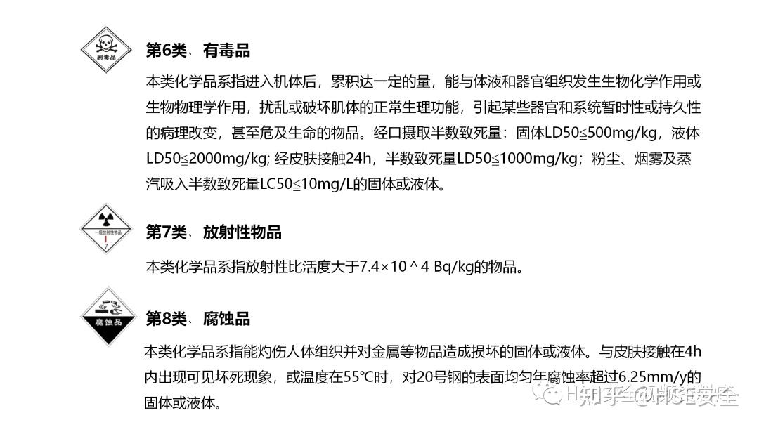 第八类:腐蚀品,指能灼伤人体组织并对金属等物品造成损伤的固体或液体。